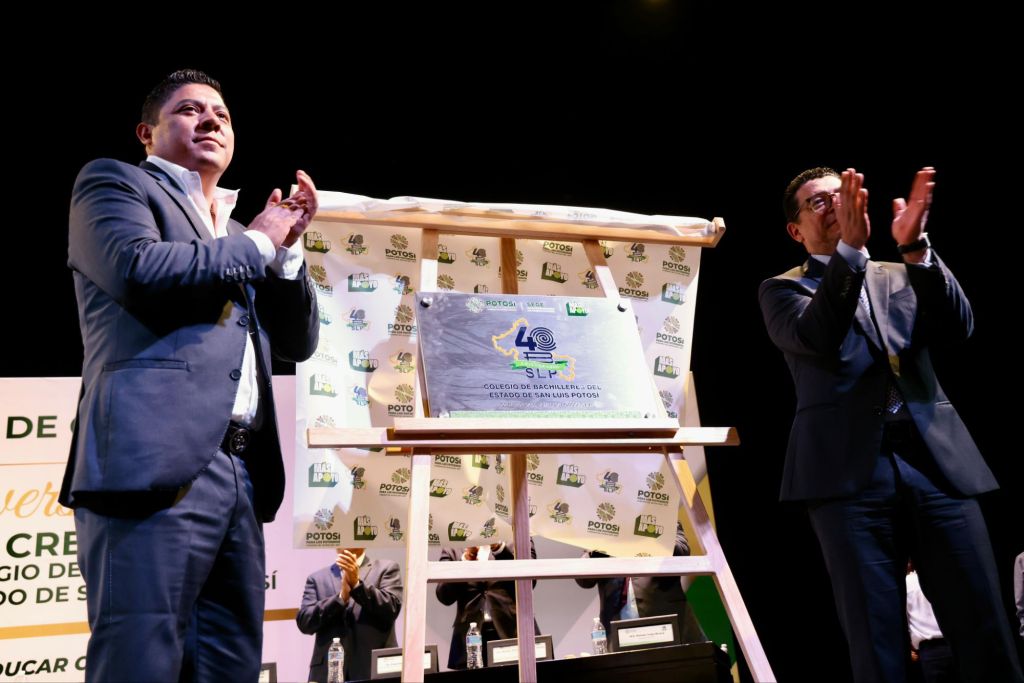 En el Teatro de la Paz, acompañado por el director general del Bachillerato del Gobierno Federal, Uladimir Valdez Pérez Núñez, el Mandatario potosino develó la placa conmemorativa, que será colocada en las oficinas principales del Cobach, resaltando que su gobierno tiene un firme compromiso con la educación mediante el impulso de planteles dignos, pues en tres años, ha construido y reconstruido 400 escuelas en las cuatro regiones, entre los que se incluyen los planteles uno en Tamazunchale y Centro EMSad en Villa de Reyes.