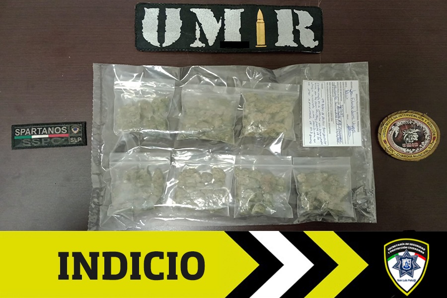 Como resultado de las acciones operativas emprendidas en las colonias de la Capital por la Secretaría de Seguridad y Protección Ciudadana (SSPC) la madrugada de este viernes se llevó a cabo el aseguramiento de un hombre de 21 años al que le fueron encontrados siete envoltorios que contenían hierba seca verde similar a la mariguana. El detenido fue detectado a bordo de un taxi que no portaba placas de circulación.