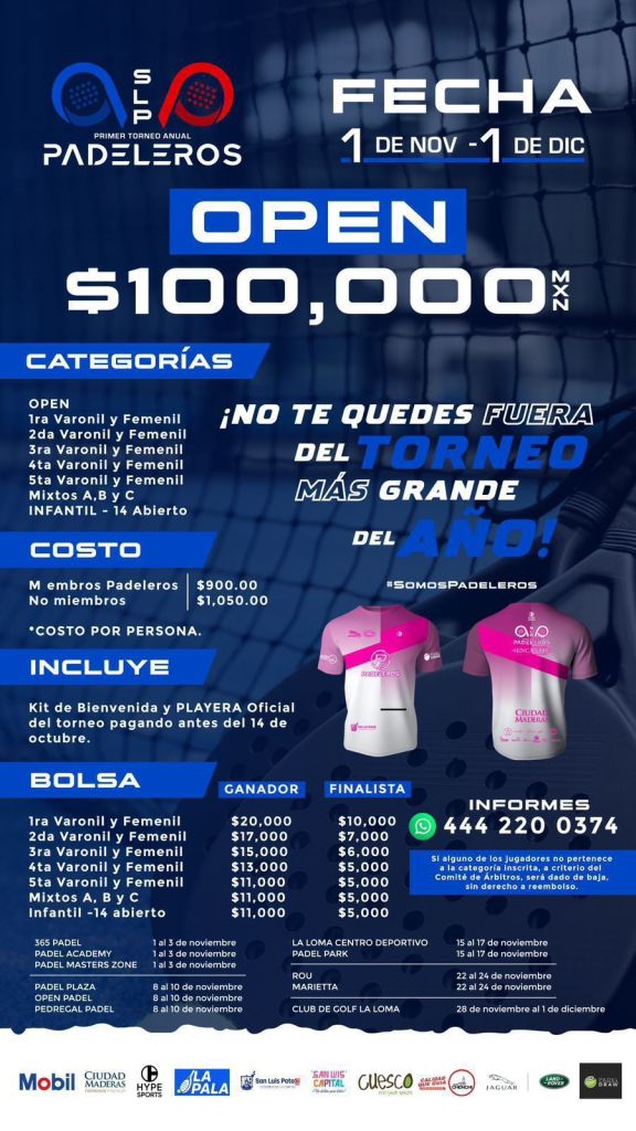 Las inscripciones ya están abiertas, y para conocer a detalle las categorías, los requisitos de inscripción, así como las ubicaciones de las diferentes canchas participantes, las y los interesados pueden consultar las redes sociales Instagram Padeleros MX y en Facebook Padeleros SLP, o vía WhatsApp al 4442200374.
