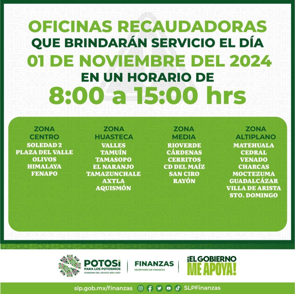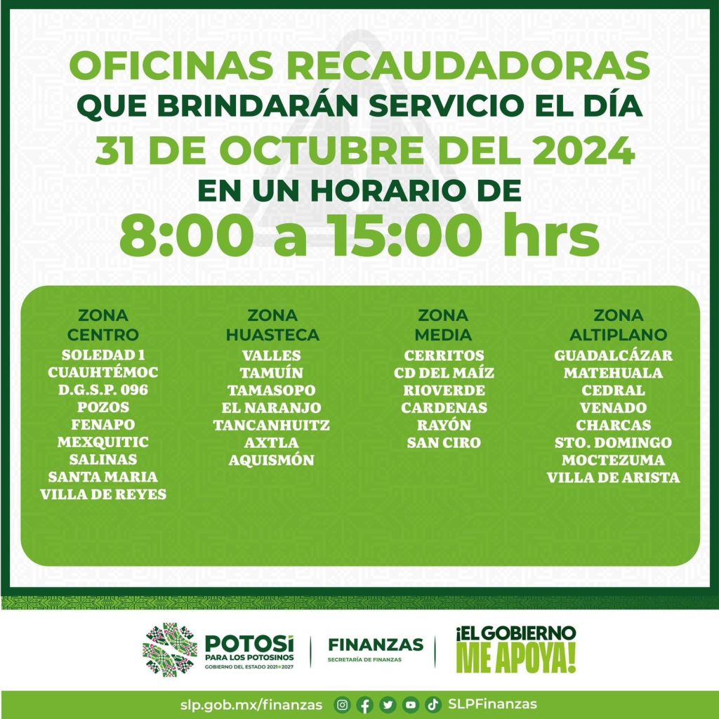 Detalló que este jueves 31 de octubre, ofrecerán servicio en las oficinas: Soledad 1, Cuauhtémoc, Seguridad Pública, Pozos, Fenapo, Mexquitic, Salinas, Santa María, Villa de Reyes, Valles, Tamuín, Tamasopo, El Naranjo, Tancanhuitz, Axtla, Aquismón, Rioverde, Cárdenas, Cerritos, Ciudad del Maíz, Rayón, San Ciro de Acosta, Matehuala, Cedral, Venado, Charcas, Moctezuma, Santo Domingo, Guadalcázar y Villa de Arista.