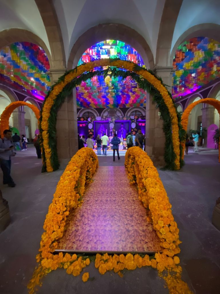 Un majestuoso puente cubierto de flores de cempasúchil, le ha dado la bienvenida a cientos de familias y turistas a la ofrenda monumental de Día de Muertos instalada en el Palacio de Gobierno de San Luis Potosí. Este año el altar fue creado en honor a las mascotas que han partido de este mundo terrenal; destacando que durante esta temporada también nos visitan estas ánimas que fueron integrantes importantes en los hogares potosinos.