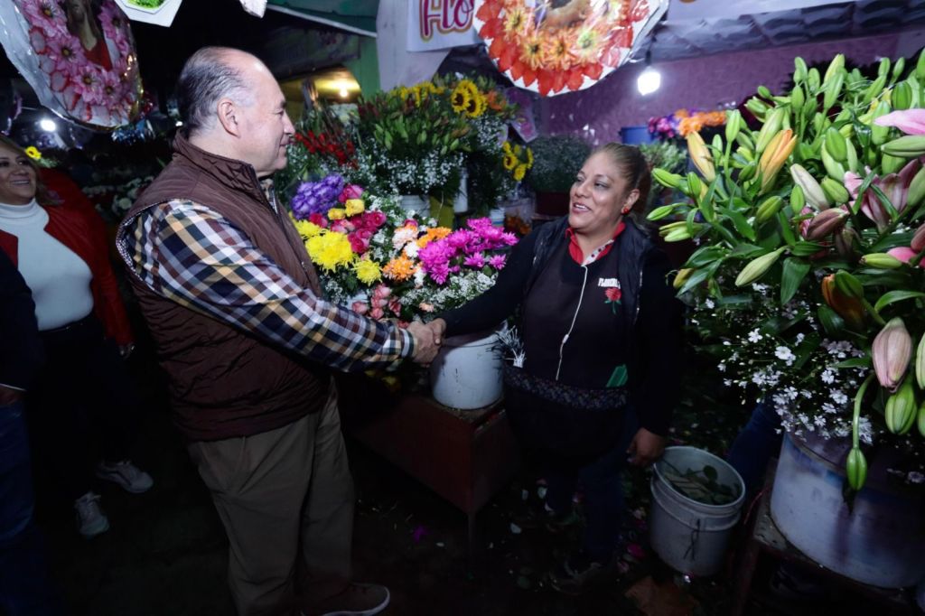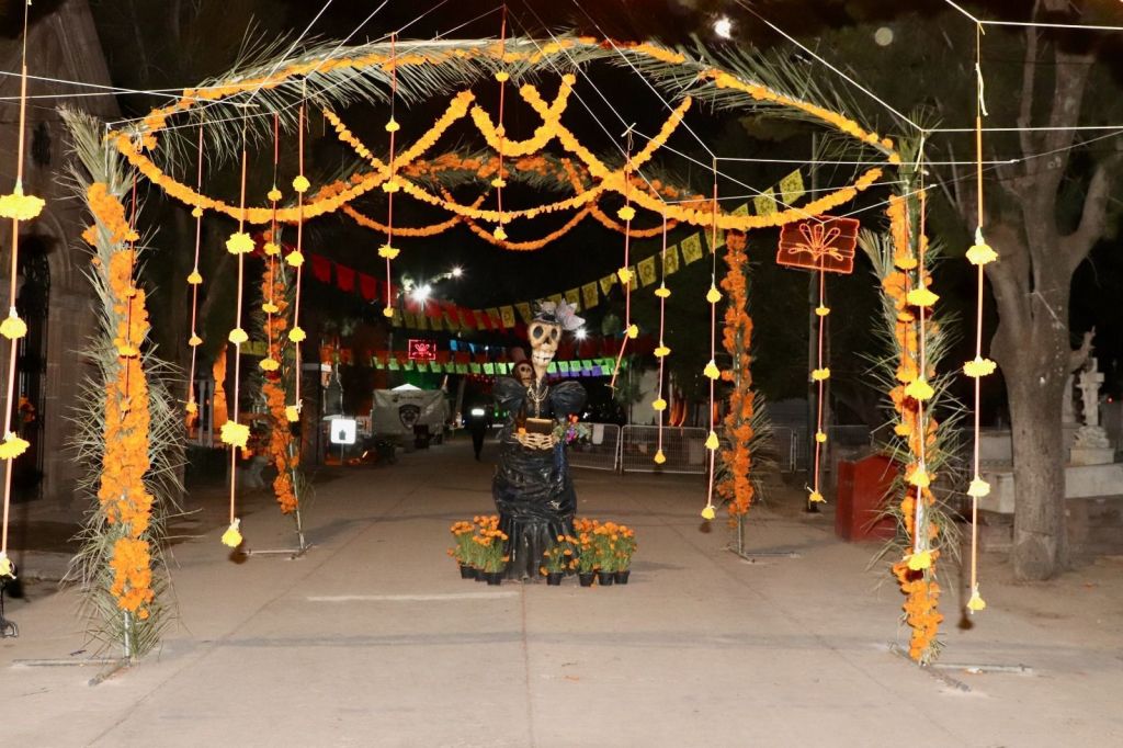 El Presidente Municipal hizo un recorrido nocturno por los puestos instalados afuera de este centenario cementerio municipal, después ingresó al panteón del Saucito, que por primera vez estará abierto las 24 horas como parte del festejo del Día de Muertos.