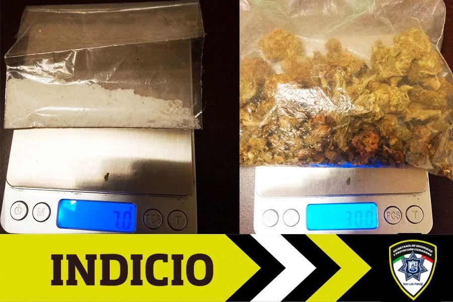 Al realizar la revisión preventiva de seguridad se les encontró en posesión de una bolsa de hierba seca verde similar a la marihuana además de un envoltorio que contenía polvo blanco granulado con las características de la droga conocida como cristal.