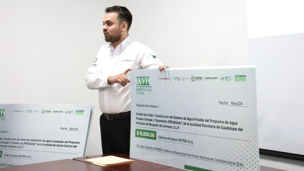 En cumplimiento con la instrucción del Gobernador Ricardo Gallardo Cardona, de fortalecer la participación ciudadana, la rendición de cuentas y la transparencia, la CGE entregó un apoyo económico de 15 mil pesos al comité de obra ganador del primer lugar, por la vigilancia ciudadana en la «Construcción del Sistema de Agua Potable» en la localidad Ranchería de Guadalupe de Mexquitic de Carmona; que también resultó ganador de la etapa nacional en el «Premio Nacional de Contraloría Social», coordinado por la Secretaría de la Función Pública (SFP) y la Comisión Permanente de Contralores Estados-Federación (CPCE-F).