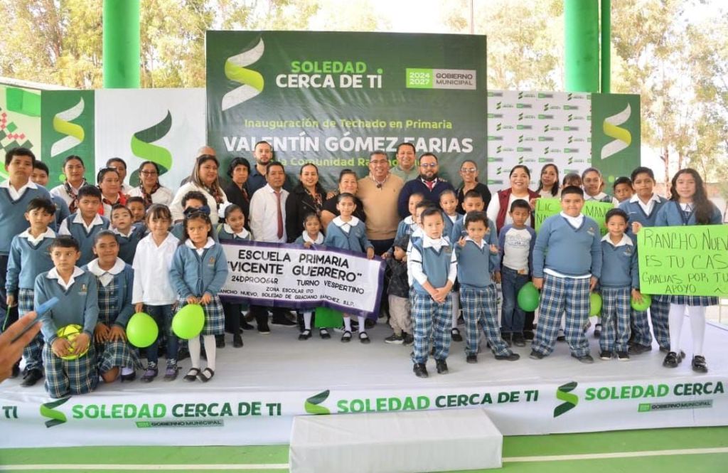 Con gran entusiasmo y gratitud, las y los padres de familia y directivos de la escuela primaria “Valentín Gómez Farías” y “Vicente Guerrero” de la colonia Rancho Nuevo, celebraron la entrega de un techado que beneficiará a más de 540 alumnas y alumnos de los turnos matutino y vespertino; la infraestructura, impulsada por el Gobierno Municipal de Soledad de Graciano Sánchez, es la respuesta al compromiso establecido por el Alcalde, Juan Manuel Navarro Muñiz, de estar cerca de las necesidades de la población, y se suma al esfuerzo de la actual administración para mejorar la calidad de los espacios educativos en el municipio.