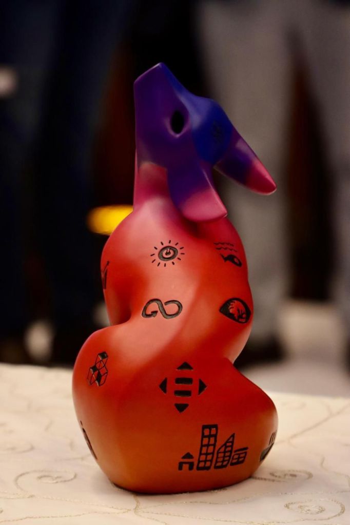 El Distintivo Comunidad Futuro, diseñado por el escultor Sergio Eduardo Madrid Jiménez, consiste en una estatuilla que representa un coyote, símbolo característico de la región. La pieza incorpora los colores y elementos de los ODS, reflejando el compromiso de las empresas con la sostenibilidad y la construcción de un futuro más inclusivo y responsable.