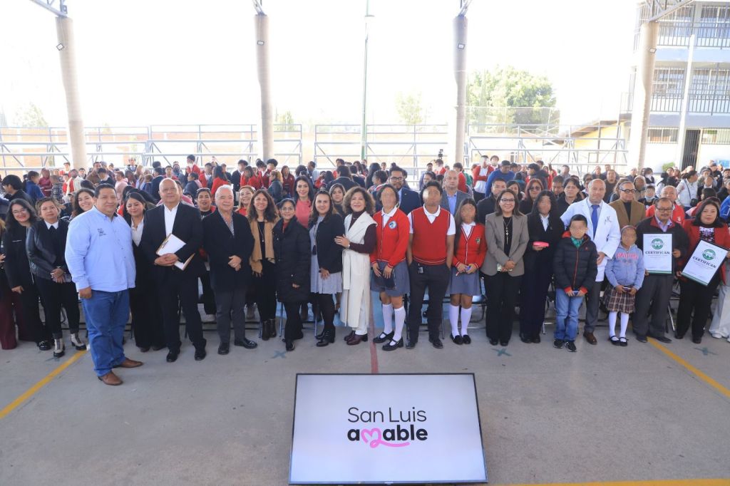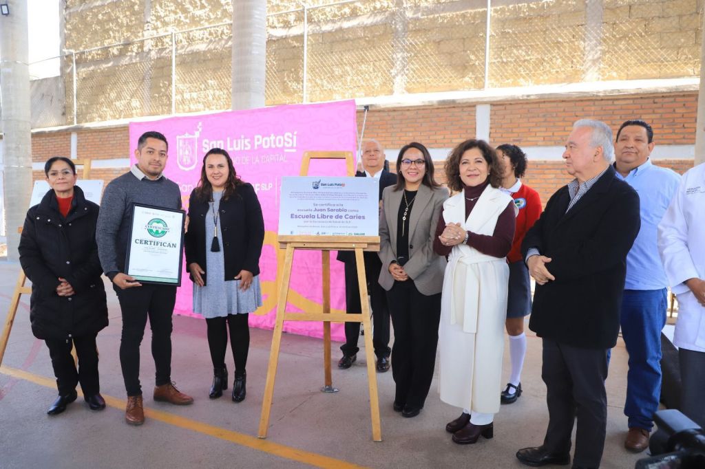 SLP.- La Presidenta del DIF Municipal de San Luis Potosí, Estela Arriaga Márquez, entregó junto con la Secretaría de Salud Estatal, cuatro certificaciones a “Escuelas libres de caries”, así como más de 400 lentes graduados correspondientes al programa “La Ruta de la Salud Escolar”, misma que complementa la atención en salud bucodental y oftalmológica de las y los estudiantes de primarias, secundarias y preparatorias del sistema educativo en la capital potosina.