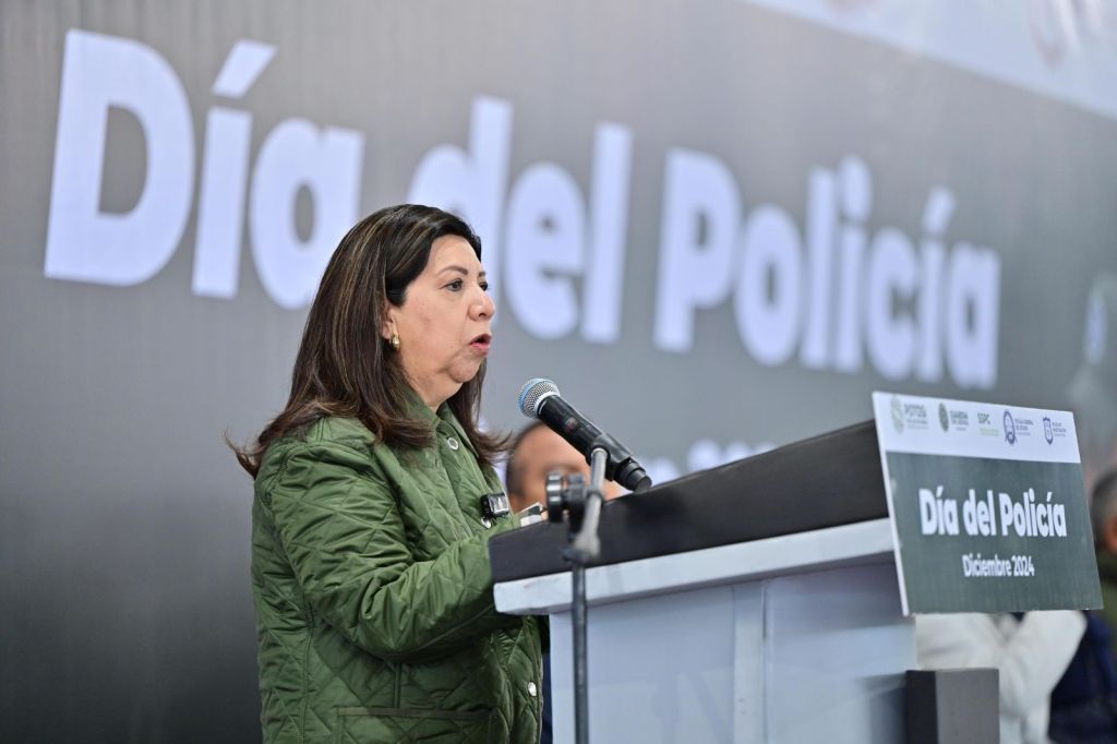 Durante su discurso, la Fiscal General destacó el papel fundamental que desempeñan las y los policías, subrayando la confianza que la sociedad deposita en ellos y la importancia de su misión en la impartición de justicia.