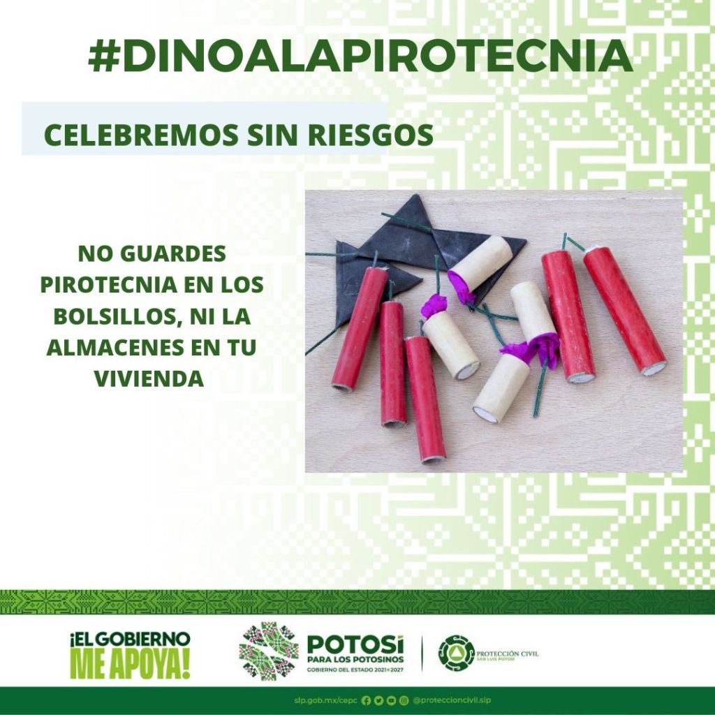 Por instrucción del Gobernador del Estado, Ricardo Gallardo Cardona, solicitó a madres y padres de familia evitar que menores de edad detonen artefactos de este tipo, usar encendedores de mecha larga, colocar el cohete en el suelo y nunca en la mano, no arrojarlos cerca de autos, personas o animales, no arrojarlos dentro de lotes baldíos o lugares con maleza con el fin de evitar incendios urbanos.