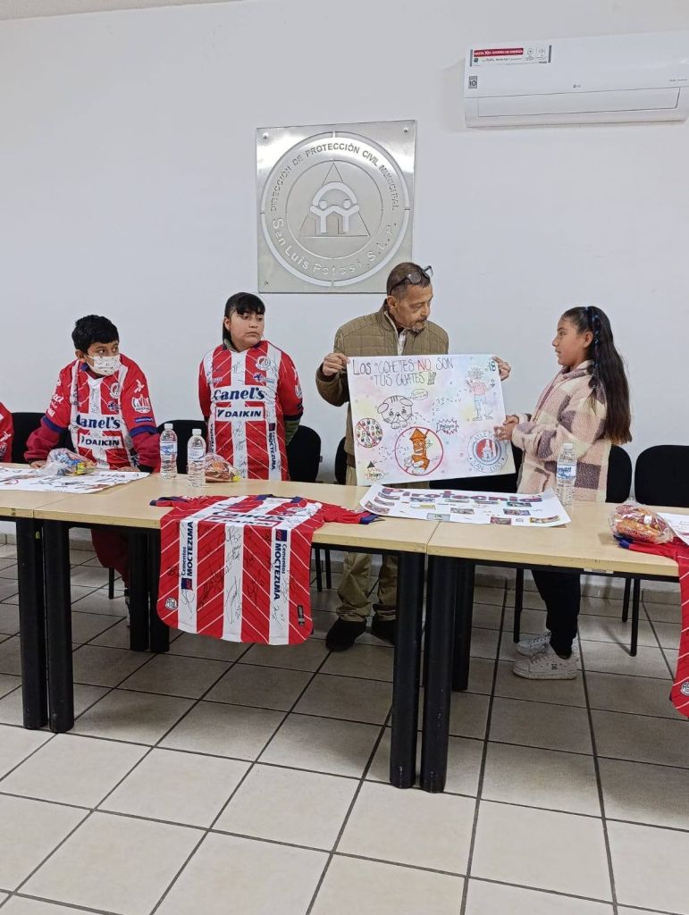 - A esta campaña preventiva se unió el Club Atlético de San Luis, que obsequió playeras oficiales; en los dibujos de las niñas y niños ganadores se resaltaron los riesgos que implica el uso de pirotecnia.
