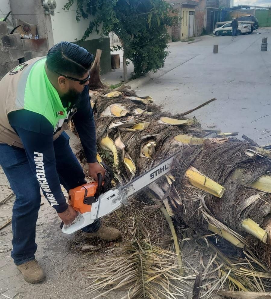 Entre los reportes de árboles caídos, informó que ocurrieron en las colonias Cactus y La Sierra, aunque no hubo riesgos graves para la población. Agregó que durante la madrugada se atendió el reporte de una palma en colonia La Virgen, de grandes dimensiones que obstruía la vía, lo que permitió a los equipos de emergencia continuar con las labores de despeje.