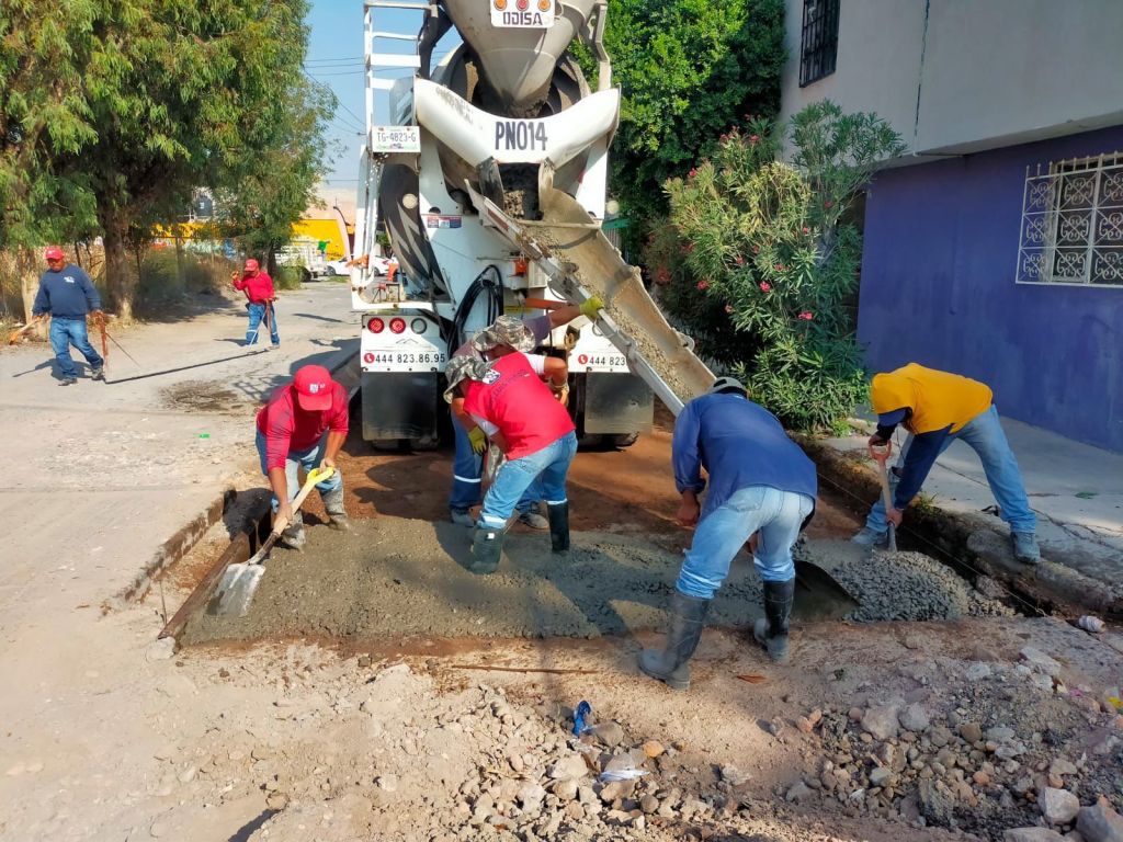 Con material de concreto está en proceso la calle Ópalo, en el tramo de Industrias a Acerina de la colonia Esmeralda; así como la reposición de piezas de adoquín en la calle Netzahualcóyotl, de la calle Tangamanga a Reforma, en el Barrio de Tlaxcala.