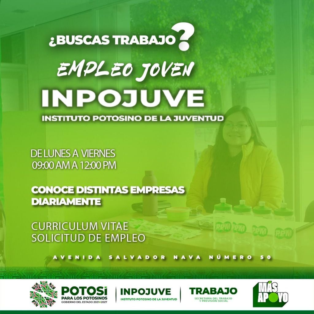 La bolsa de trabajo del programa «Empleo Joven» opera en las instalaciones del Inpojuve, ubicadas en avenida Salvador Nava número 50 y las atenciones son de lunes a viernes, de 10:00 a 15:00 horas. Para participar deben llevar consigo su solicitud de empleo y documentación en orden.