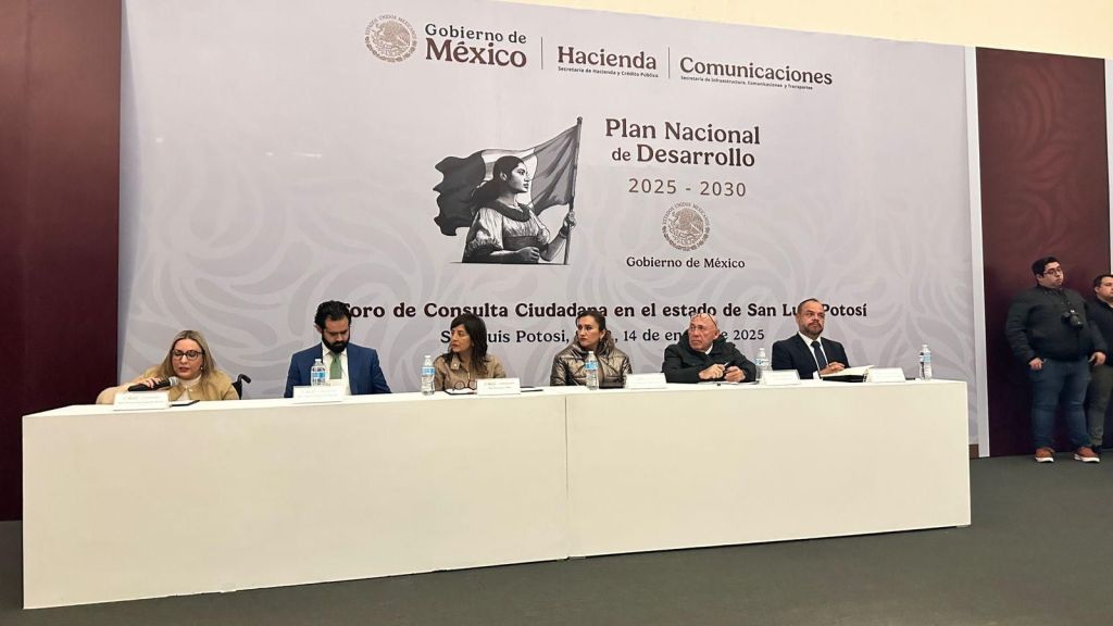 La servidora pública federal recibió y agradeció la entrega de ocho propuestas para integrar el PND, de manos de Elías Dip Ramé, presidente de la Confederación Nacional de Transportistas Mexicanos, A.C. (CONATRAM); Enrique Villafuerte en representación de la Unión de Usuarios de la Zona Industrial; Leopoldo Stevens Pérez, de la Cámara de la industria de la Construcción de San Luis Potosí; Raúl Torres Mendoza, de la Alianza Mexicana de Organizaciones de Transportistas (AMOTAC); Mario García Valdez, secretario de Cultura en San Luis Potosí; de la organización Vida Independiente para personas con discapacidad A.C., Silvia Degante Romero; Juan Manuel Millán Fuentevilla, de la Cámara Nacional de Autotransporte de Carga (CANACAR) y Héctor Laces Mina, del Colegio de Ingeniero Civiles de México.