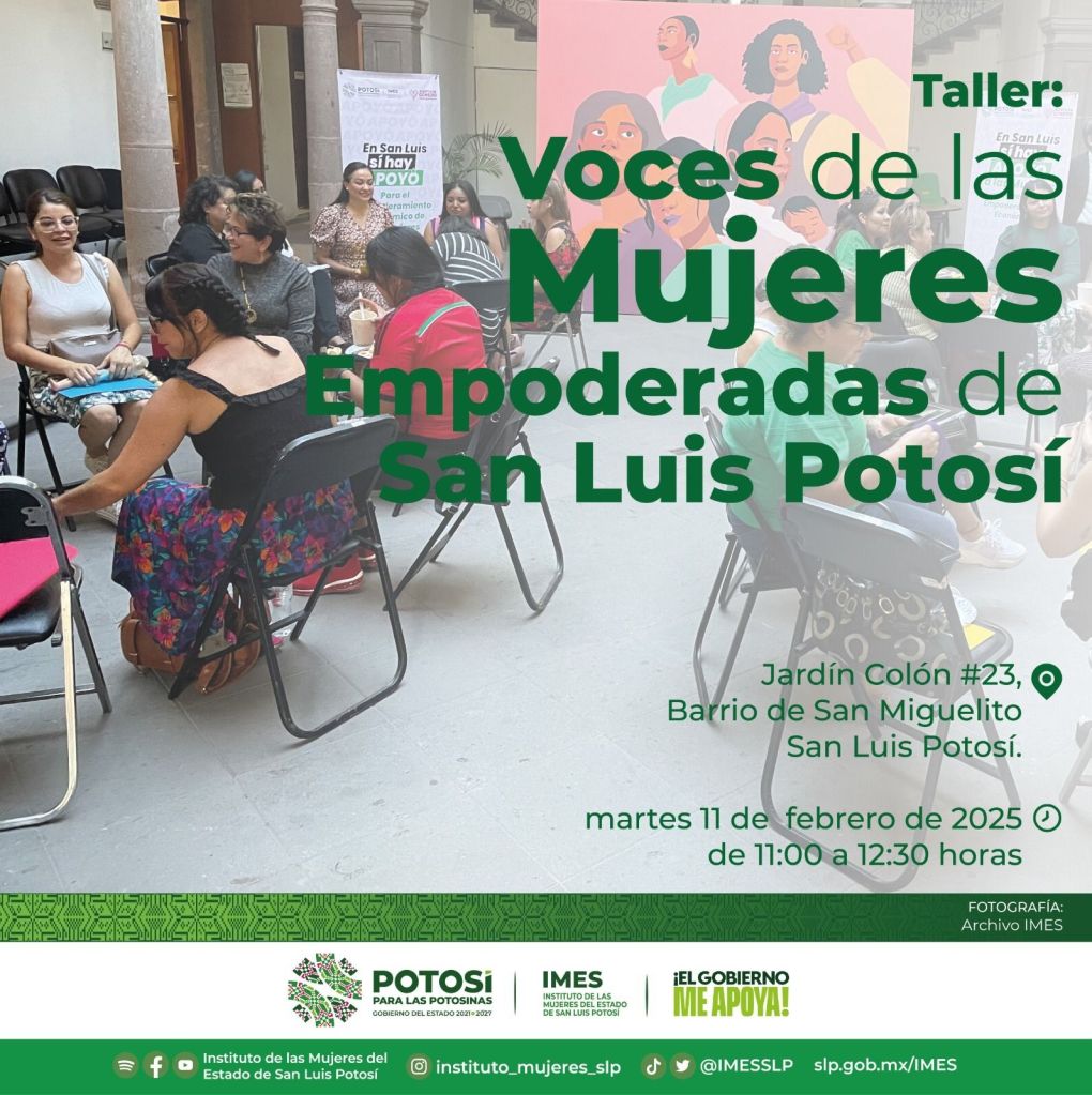Como parte de las acciones y el apoyo interinstitucional para empoderar a las potosinas, el Instituto de las Mujeres del Estado (Imes), invita al taller “Voces de las mujeres empoderadas de San Luis Potosí”, el martes 11 de febrero en el patio de la dependencia ubicado en jardín Colón 23 en el barrio de San Miguelito de 11:00 a 12:30 horas.