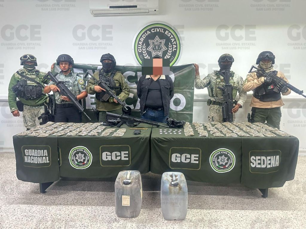 Cárdenas, SLP.- Como parte de los resultados contundentes en el combate a la delincuencia, agentes de la Guardia Civil Estatal (GCE), en coordinación con efectivos de la Secretaría de la Defensa Nacional (Sedena) y Guardia Nacional, asestaron un fuerte golpe a célula crimin@l, tras la detención de su presunto líder, quien fue capturado con más de un kilo de marihuana, dosis de metanfetaminas, armamento, entre otros objetos constitutivos de delit0.