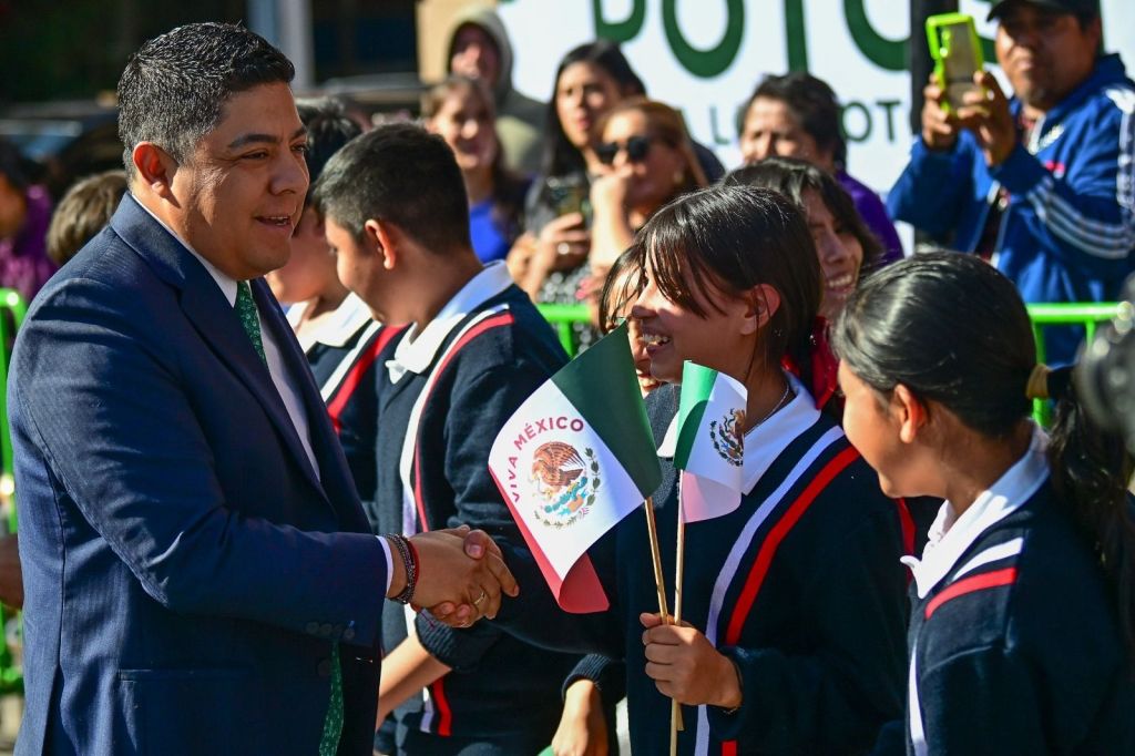 En la plaza de Los Fundadores, al presidir la ceremonia, el Mandatario Estatal resaltó que su Gobierno trabaja por su gente, y especialmente por niñas, niños y jóvenes, porque son el presente y el futuro de San Luis Potosí, por lo que su prioridad es la educación, y los resultados son la construcción de más de 400 nuevas escuelas en todo el Estado, la entrega de apoyos como zapatos, uniformes y útiles escolares gratuitos, así como el sistema MetroRed, para que nadie se quede sin ir a la escuela por falta de dinero para el pasaje, mientras que con los apoyos alimentarios nadie llegará con hambre.