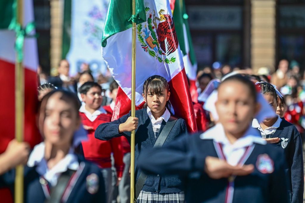 Ante la comunidad escolar, autoridades civiles y militares, invitó a las y los estudiantes a mirar a su Bandera con orgullo, porque representa la grandeza de México, pero también su futuro, por lo que, con su esfuerzo, con su estudio y con su amor a este país, también podrán escribir la historia.