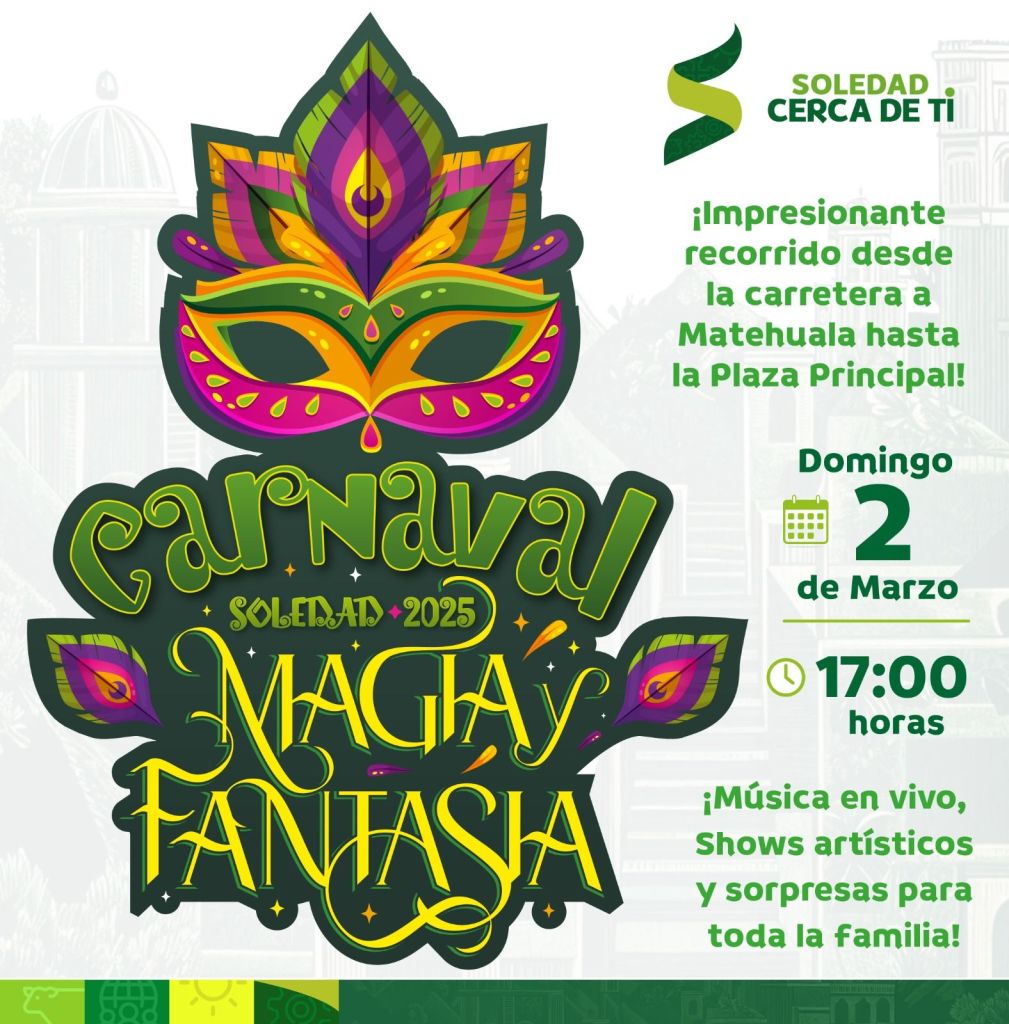El Carnaval de Soledad 2025 está a punto de comenzar, y el Gobierno Municipal de Soledad de Graciano Sánchez invita a toda la ciudadanía a ser parte de esta gran fiesta, con la temática «Magia y Fantasía», con un evento que promete una celebración llena de color, música y alegría, logrando consolidarse como una de las festividades más esperadas del año, y fortaleciendo la unión de las familias soledenses.