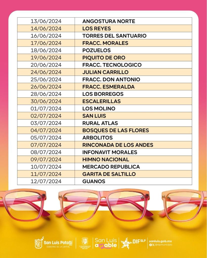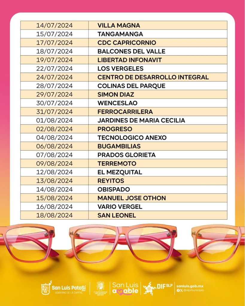 SLP.- La Presidenta del Sistema Municipal DIF de San Luis Potosí invitó a las y los beneficiarios del programa de lentes graduados de la “Ruta de la Salud” que aún no han recibido su apoyo, para que acudan a recogerlos en las instalaciones ubicadas en Xicoténcatl 1650, de lunes a viernes en un horario de 8:00 a 15:00 horas.
