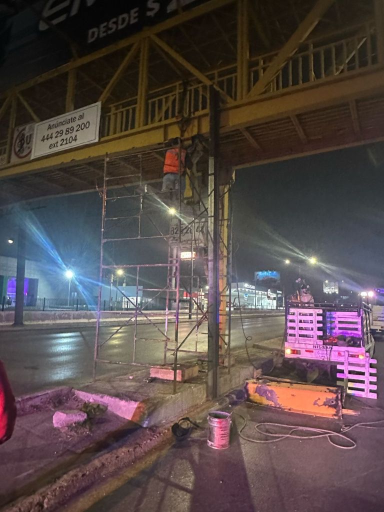 Con el objetivo de garantizar la seguridad de peatones y automovilistas, el Gobierno Municipal de San Luis Potosí, a través de la Dirección de Obras Públicas, tomó acciones inmediatas para reparar los daños en la base del puente peatonal sobre la avenida Salvador Nava Martínez, a la altura de la Clínica 45 del Instituto Mexicano del Seguro Social (IMSS).