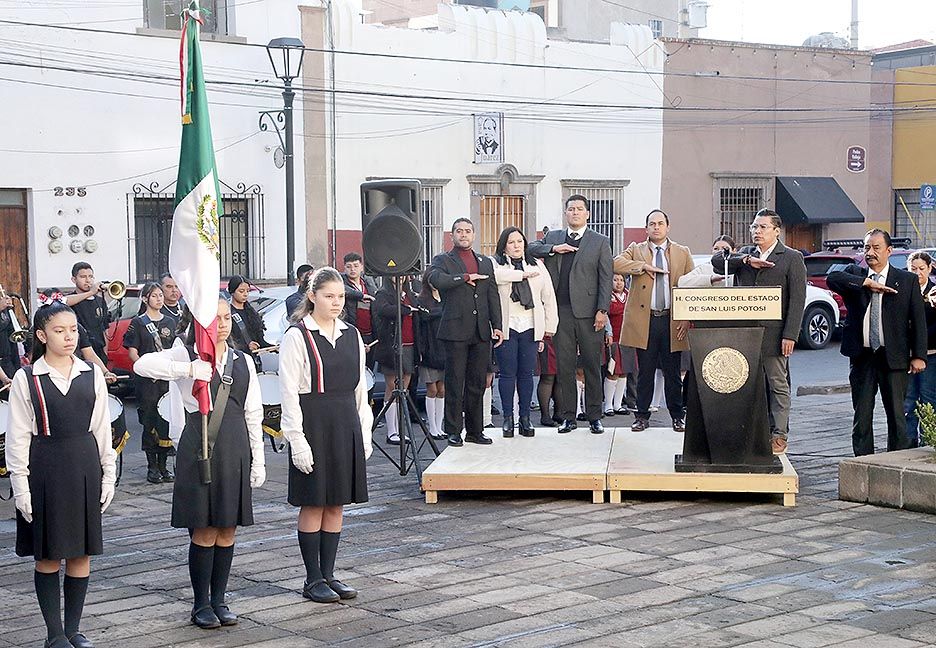 Se colocó una ofrenda floral en el busto del ex presidente Juárez y se rindieron los honores a la Bandera además de entonar el Himno Nacional; acudieron representantes de la Masonería potosina.