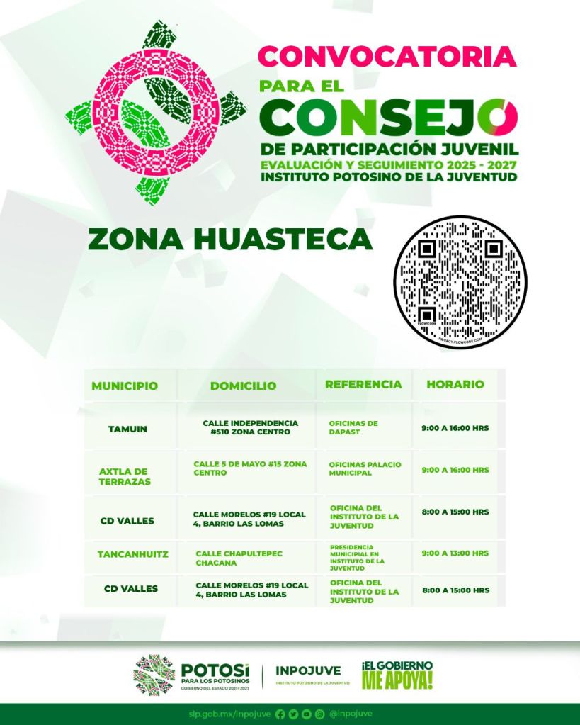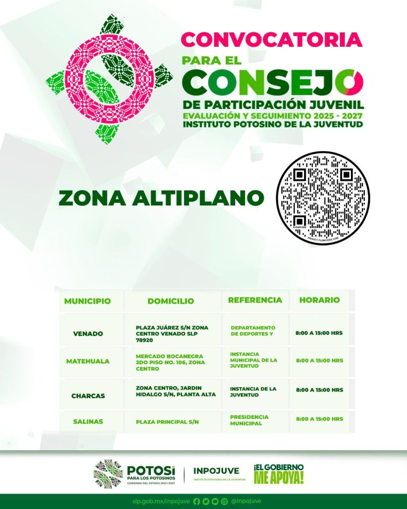 El Instituto Potosino de la Juventud (Inpojuve), en coordinación con diversas instancias municipales, impulsa la participación juvenil y pone a disposición de las y los jóvenes potosinos de las cuatro regiones, la convocatoria para formar parte del Consejo Juvenil de Evaluación y Participación 2025-2027.