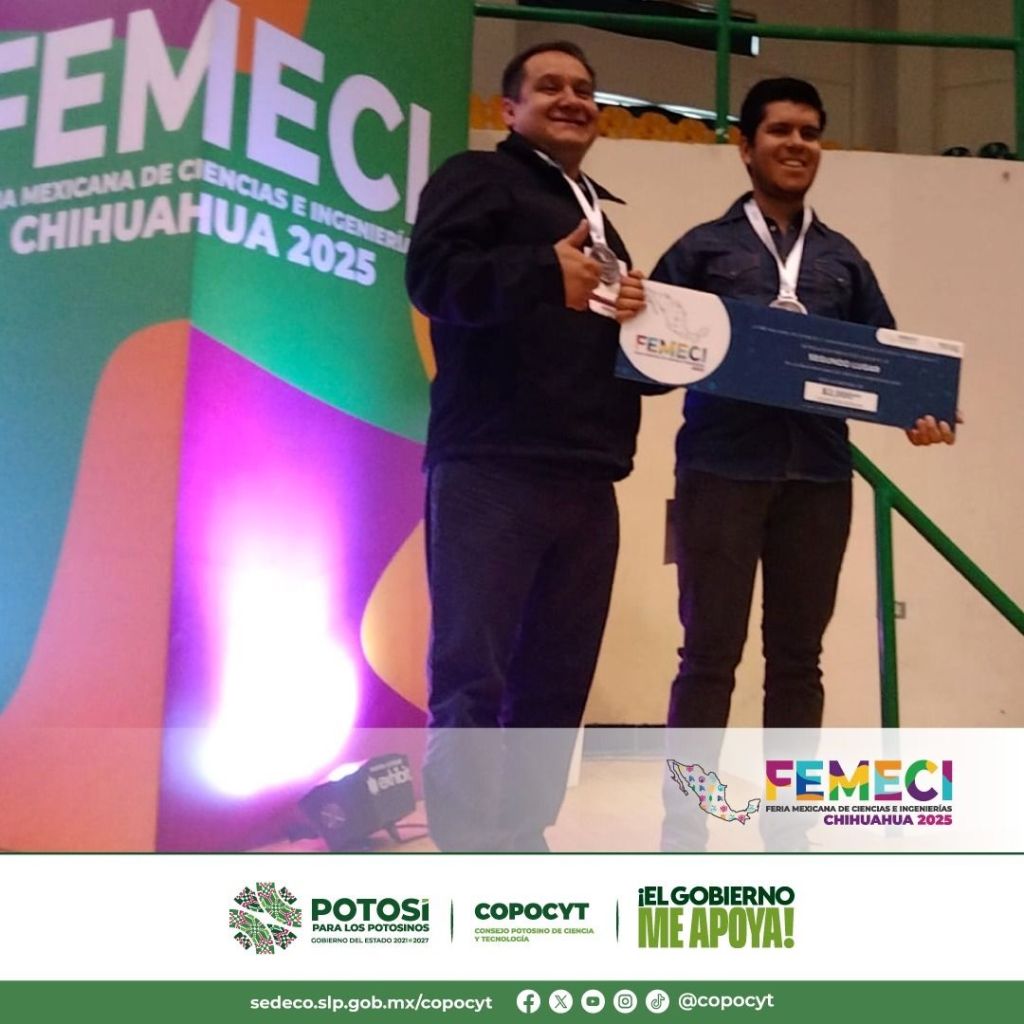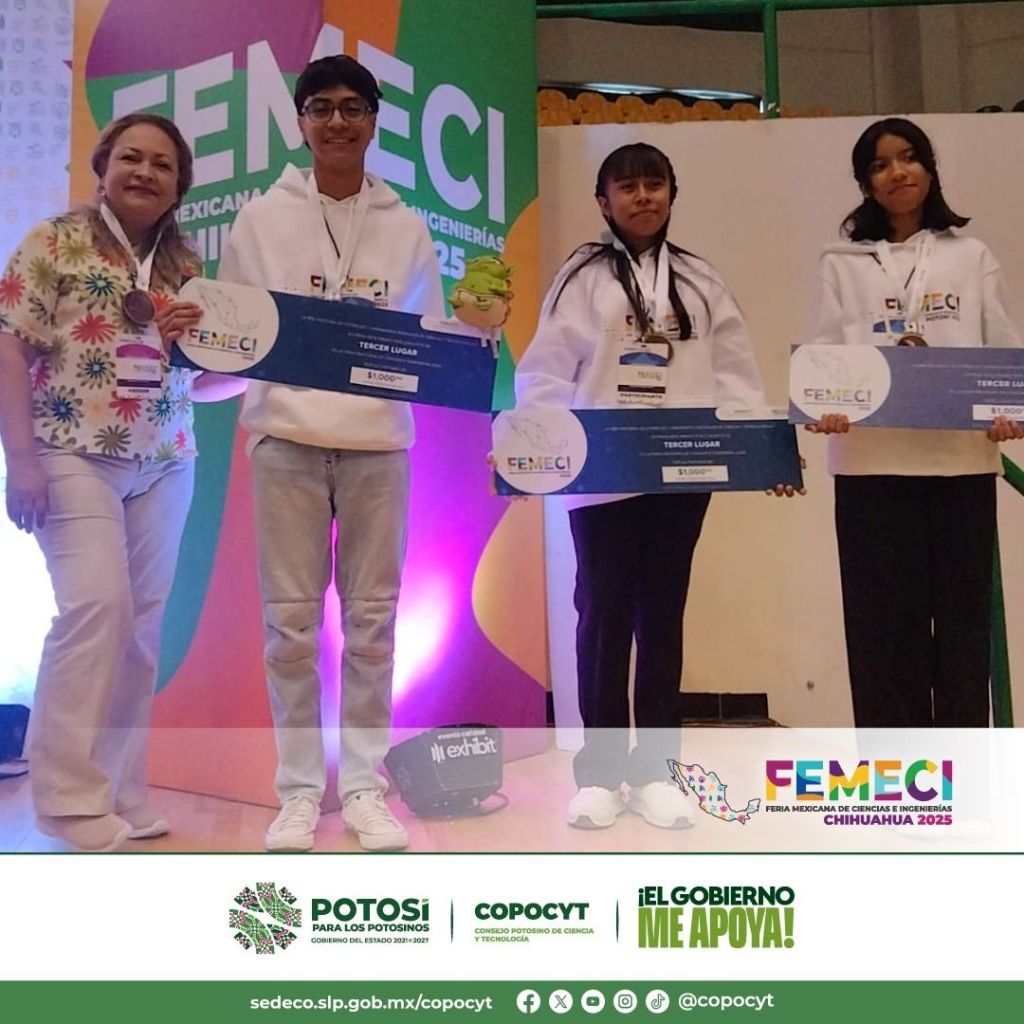San Luis Potosí logró cuatro premios en la Feria Mexicana de Ciencias e Ingenierías 2025 (Femeci), celebrada en Ciudad Juárez, Chihuahua, con un primer lugar, dos segundos lugares y un tercer lugar, colocándose por cuarto año consecutivo, entre los tres estados con el mayor número de proyectos ganadores, de acuerdo con la Red Nacional de Consejos y Organismos Estatales de Ciencia y Tecnología (Rednacecyt).