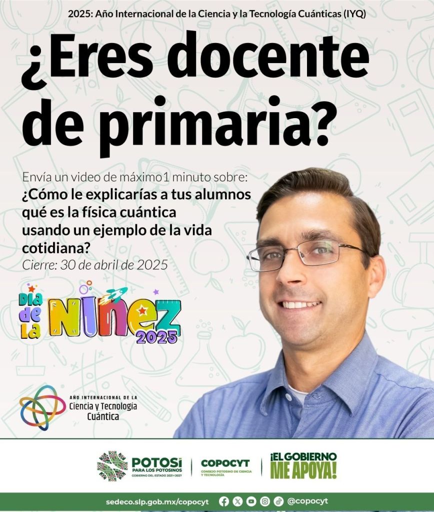 En el marco del Año Internacional de la Ciencia y la Tecnología Cuánticas, el Gobierno del Estado invita a docentes de educación básica de instituciones públicas y privadas de San Luis Potosí, a participar con un breve video para explicar conceptos de la ciencia y la tecnología cuánticas, utilizando ejemplos sencillos y de la vida cotidiana.