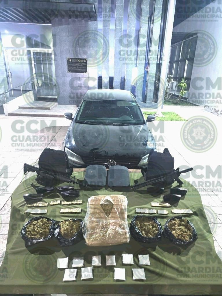 Del interior, se aseguraron dos armas larga calibre 5.56 abastecidas cada una con un cargador con 30 cartuchos útiles, 5 cargadores abastecidos con 20 cartuchos útiles, 10 dosis de un material blanco granulado similar a la droga sintética conocida como «cristal», un paquete con hierba seca similar a la marihuana, 4 bolsas con el mismo vegetal y 2 chalecos tácticos.