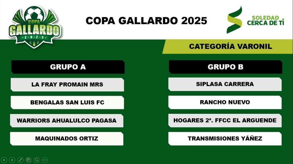 Con una impresionante premiación en efectivo de más de 500 mil pesos, y en el marco de la Feria Nacional de la Enchilada (FENAE) 2025, quedó listo el rol de juego de las tres primeras jornadas de la Copa Gallardo de fútbol, que se realizará en Soledad de Graciano Sánchez del 16 al 20 de abril, correspondiente a la categoría Varonil, teniendo como sede las canchas de la Unidad Deportiva “21 de Marzo” en la colonia San Antonio.