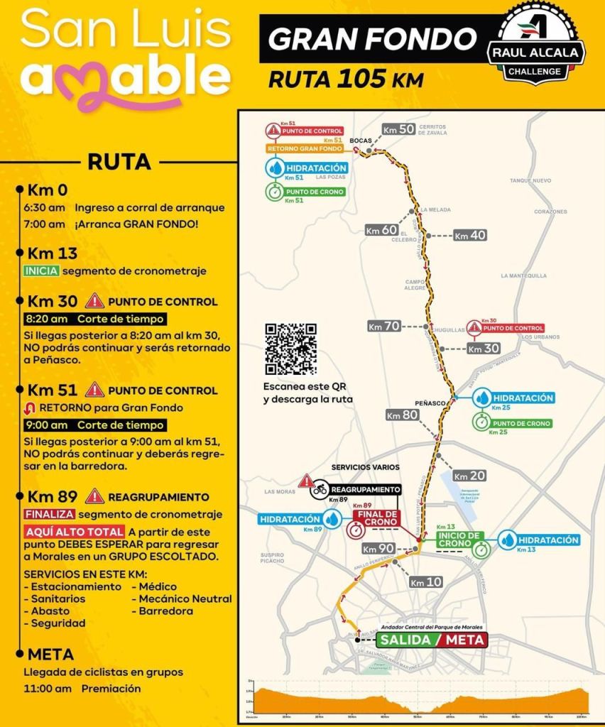 El evento, dividido en dos rutas de 50 y 105 kilómetros, tendrá una salida controlada a las 07:00 horas desde Morales hacia Circuito Potosí y el Camino a Peñasco, en este último punto iniciará la competencia por bloques hacia la delegación de Bocas.