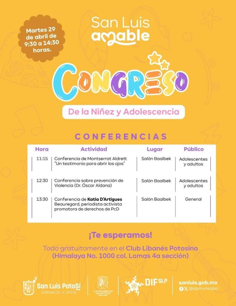 SLP.- El Sistema Municipal DIF invita a todas las familias a participar en el Congreso de la Niñez y Adolescencia, que se llevará a cabo este martes 29 de abril en el Club Libanés, de 9:00 a 14:30 horas.