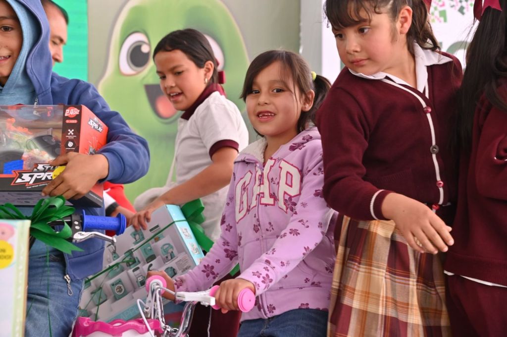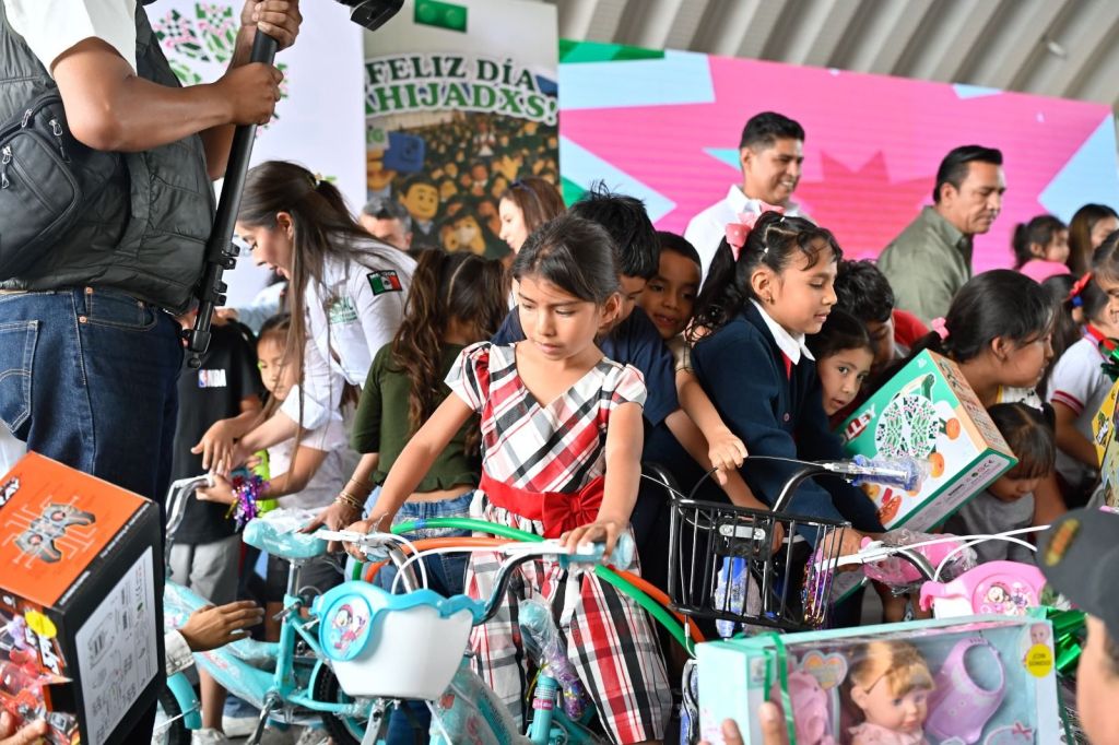 Posteriormente, invitó a las y los menores a subir al escenario para participar en bailes y la entrega de juguetes, y entregó bicicletas, muñecas, carritos, pelotas y balones que llenaron de emoción los rostros de todas y todos.