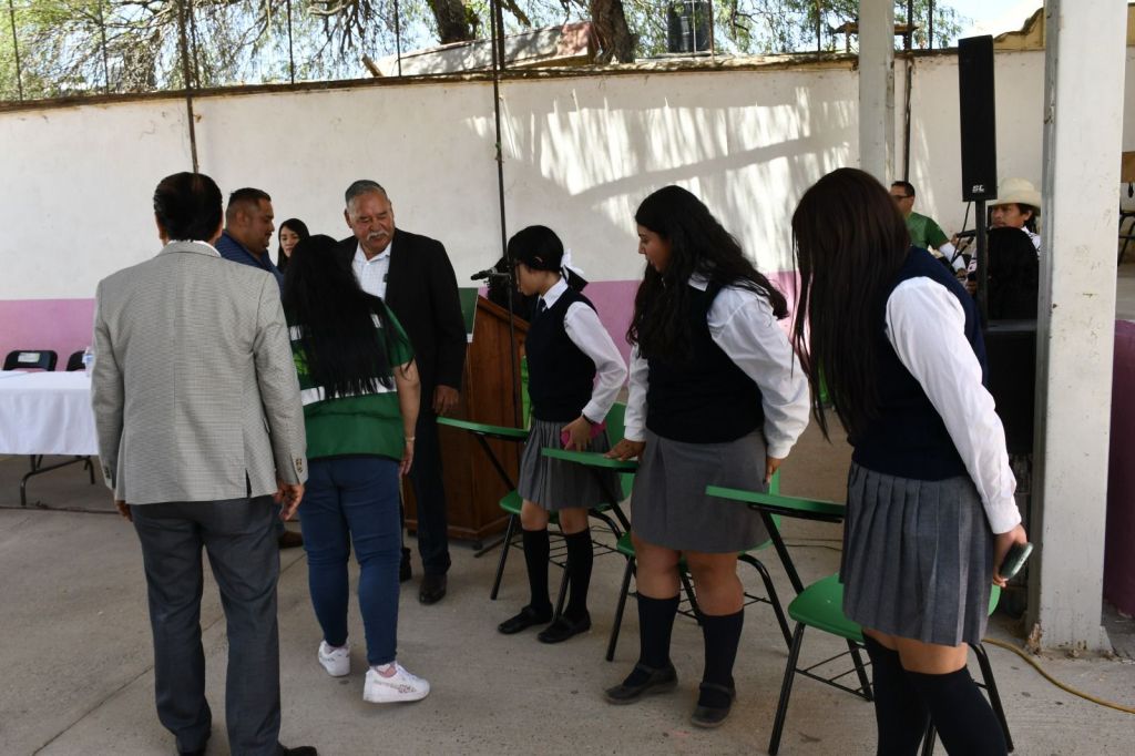 • La Secretaría de Educación entrega mobiliario en la preparatoria “Guillermo Massieu Helguera” en la localidad de Portezuelo, en el municipio de Cerro de San Pedro.