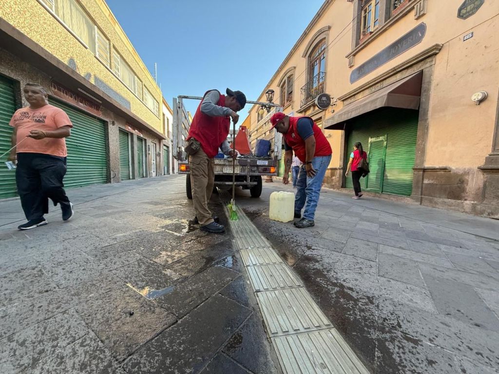 equipo de Respuesta Inmediata de la Unidad de Gestión del Centro Histórico (UGCH) realizó labores de limpieza en la línea podotáctil ubicada entre la calle Comonfort y Calzada de Guadalupe, en pleno corazón de la Capital potosina.