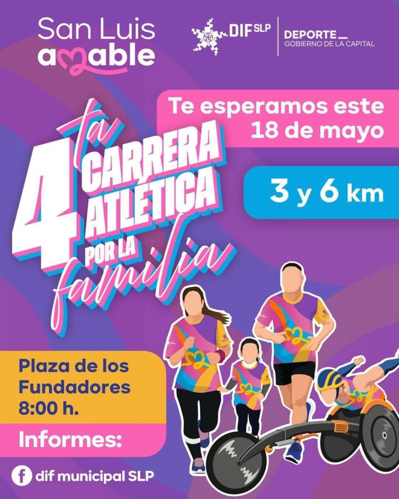 – Con el compromiso de fomentar la convivencia familiar, el deporte y los valores que fortalecen el tejido social, el Ayuntamiento de San Luis Potosí y el Sistema Municipal DIF, invitan a todas las y los potosinos, a participar en la IV Carrera Atlética por la Familia, que se llevará a cabo el próximo 18 de mayo, en un ambiente completamente familiar, accesible e incluyente.