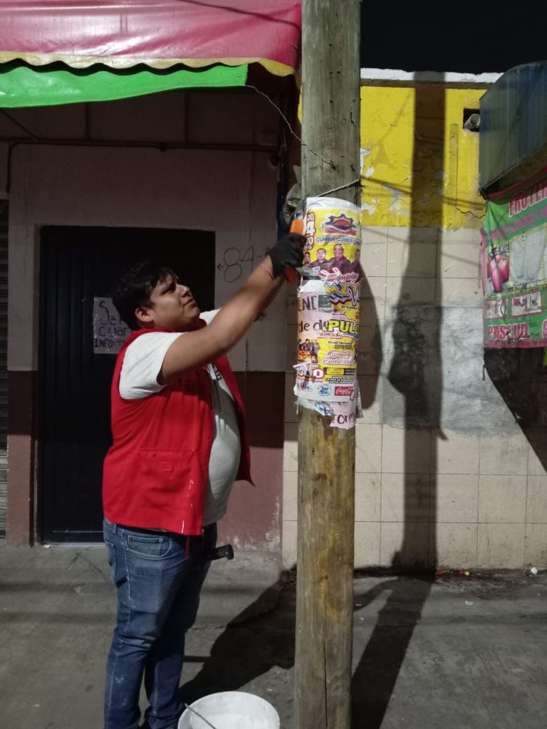 Otro grupo de trabajadores hizo una limpieza visual en los alrededores de la Iglesia El Saucito, ya que había gran cantidad de publicidad no autorizada, lo que generaba contaminación visual.