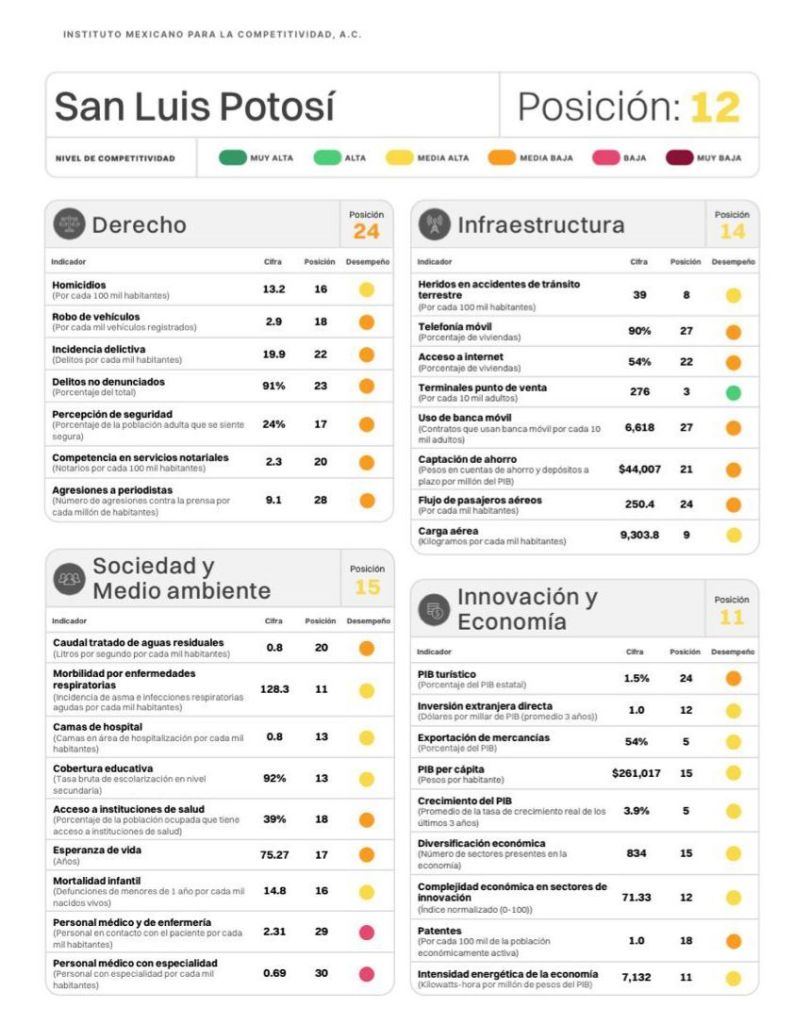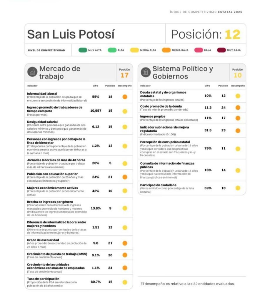 El Estado de San Luis Potosí logró un avance significativo en el Índice de Competitividad Estatal 2025 al subir seis posiciones respecto del año pasado y ubicarse en el lugar 12, además está en un nivel de media alta de acuerdo con el reporte del Instituto Mexicano de Competitividad (IMCO).