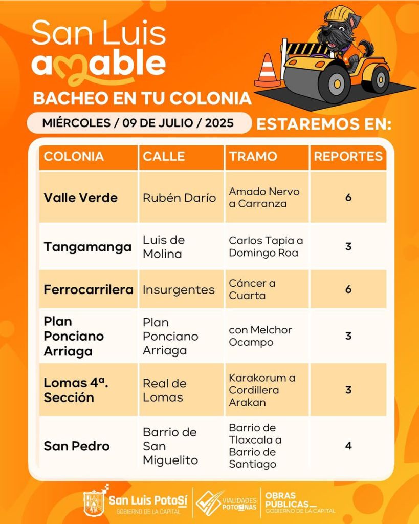 En atención a los reportes de la población, con mensajes de Whatsapp a Güicho al 4441653081, la dependencia informó que este día se trabaja en las siguientes calles y avenidas: En la colonia Valle Verde, calle Rubén Darío, de Amado Nervo a Carranza; Fraccionamiento Tangamanga, calle Luis de Molina, entre Carlos Tapia y Domingo Roa; Ferrocarrilera, de Insurgentes a Cáncer; Plan Ponciano Arriaga, entre la calle Plan Ponciano Arriaga y Melchor Ocampo; Lomas 4ª. calle Real de Lomas, de Karakorum a Cordillera Arakán.