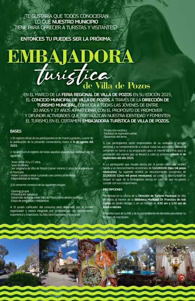 En el marco de la Feria Regional de Villa de Pozos en su edición 2025, el Gobierno Municipal de Villa de Pozos, a través de la Dirección de Turismo, convoca a todas las jóvenes de 20 a 27 años a participar en el certamen Embajadora Turística de Villa de Pozos, con el objetivo de promover y difundir actividades que fortalezcan la identidad local y fomenten el turismo en la región.