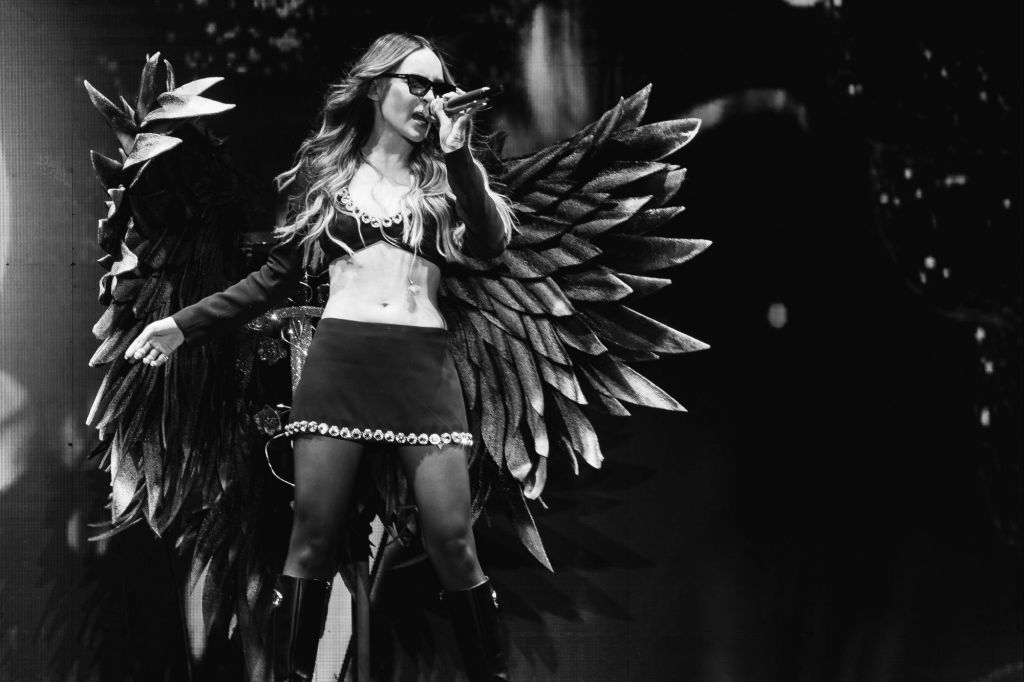 Ataviada con minifalda y top negros, lentes oscuros y unas imponentes alas, “La Beli” abrió con “Ángel”, para luego llevar la energía al máximo con “Lolita”, “Dopamina” y nuevos temas que hicieron vibrar a miles de asistentes. Desde el primer acorde, la conexión con el público fue total, logrando que cada canción se convirtiera en un coro multitudinario.