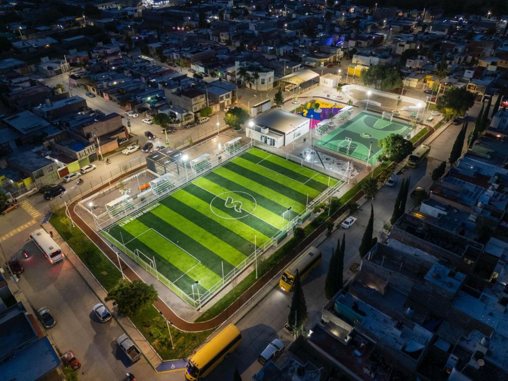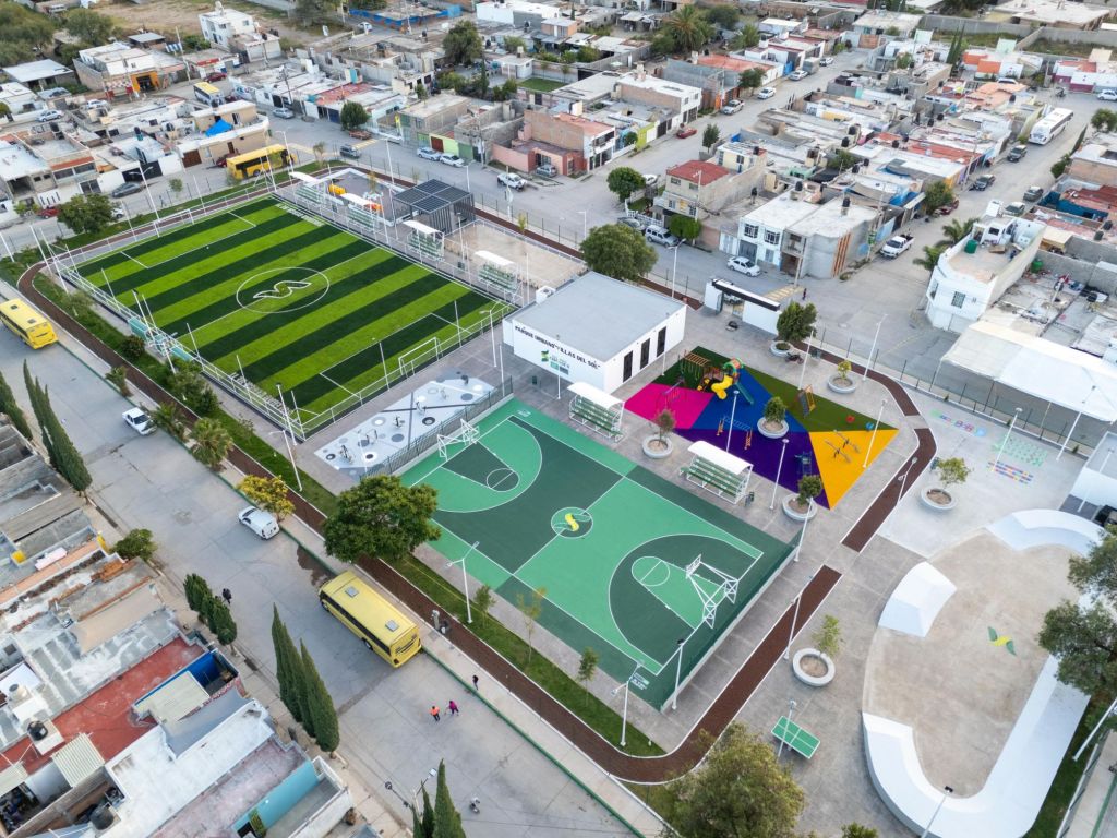 El Parque Urbano cuenta con cancha deportiva equipada con butacas, trotapista, juegos infantiles sobre pasto sintético, un módulo de usos múltiples y moderno sistema de iluminación LED y la integración de la purificadora gratuita atiende desde el primer día una necesidad básica de las y los soledenses con agua de calidad al alcance de todas y todos.