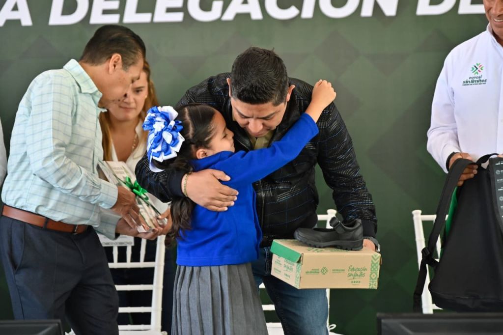 Además de los terrenos gratuitos, el Gobernador Ricardo Gallardo entregó el programa de Educación sin límites en la delegación de La Pila, para niñas y niños, que incluye útiles escolares, mochilas y zapatos, que beneficia a más de 500 mil estudiantes de educación básica de los 59 municipios.
