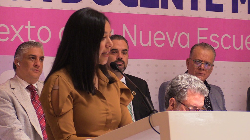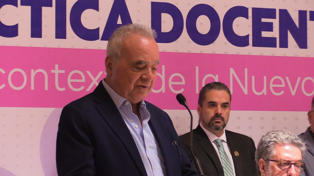 El alcalde Enrique Galindo en su intervención indicó que con el diplomado de La Nueva escuela Mexicana San Luis Potosí se conectara de lleno con la política educativa nacional que lidera la presidenta Claudia Sheinbaum y de la Secretaria de educación Pública del país-