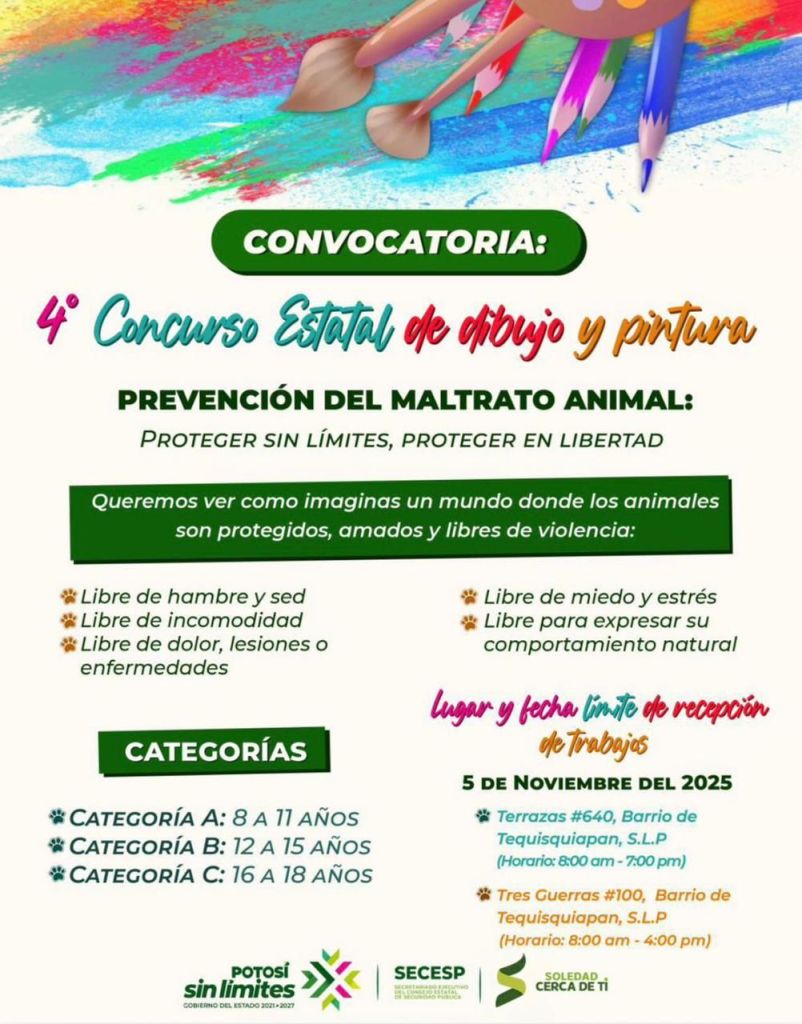 Al ser un municipio ejemplo en el cuidado y protección animal, siguiendo las directrices del Alcalde Juan Manuel Navarro Muñiz, el Ayuntamiento de Soledad de Graciano Sánchez, se suma a la convocatoria del Gobierno del Estado a través del Secretariado Ejecutivo del Consejo Estatal de Seguridad Pública (SECESP), invitando a niñas, niños y jóvenes de 8 a 18 años a participar en el Cuarto Concurso Estatal de Dibujo y Pintura 2025, con la finalidad de sensibilizar sobre el respeto y cuidado hacia los animales y prevenir el maltrato.
