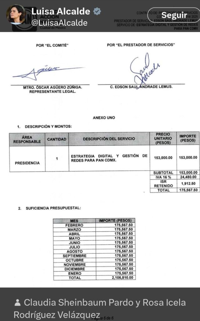 En el contrato firmado por Andrade Lemus, le corresponde recibir un monto de $175,577.50 (ciento setenta y cinco mil quinientos setenta y siete pesos con cincuenta centavos) mensuales desde ferrero del 2025 y sus servicios terminan hasta enero del 2026 recibiría un total dos millones 106 mil 810 pesos.