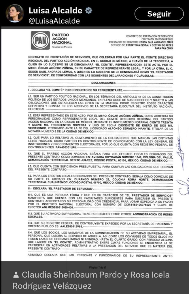 La líder nacional de Morena, Luisa María Alcalde, declaró públicamente que Edson Andrade Lemus, a quien identificó como el principal promotor de la marcha de la Generación Z del 15 de noviembre, fue empleado por el Partido Acción Nacional (PAN) para promover una Estrategia digital y manejo de redes sociales para el partido azul en contra del gobierno en la Ciudad de México.